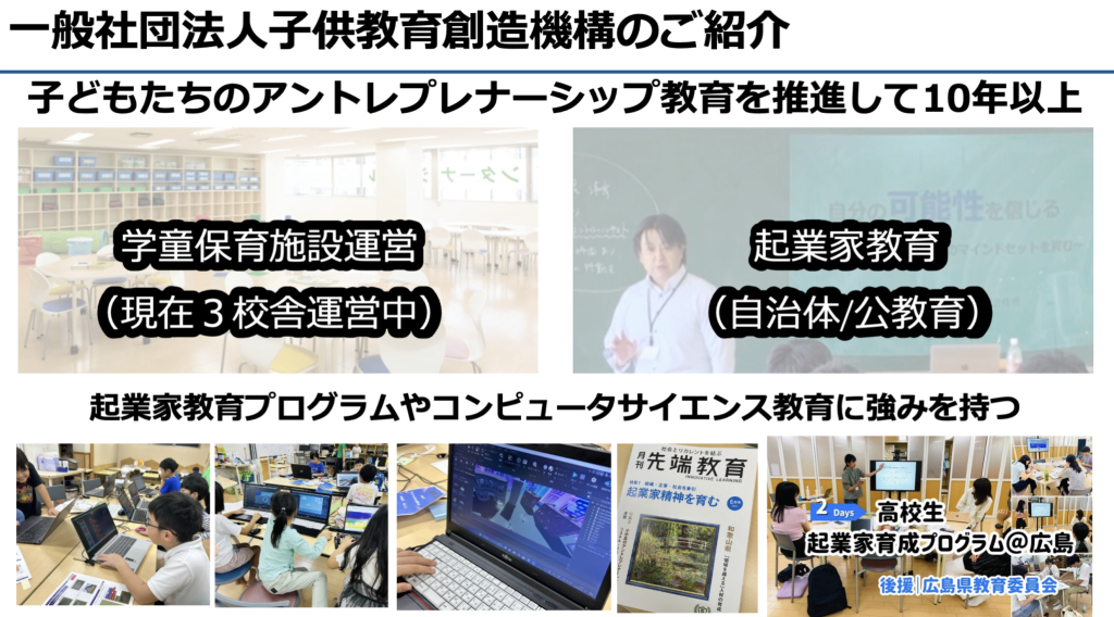 民間学童保育、STEAM教育、アントレプレナーシップ教育を提供しています。
